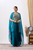 Blend a regal appeal to your wedding wardrobe in the turquoise skirt set perfect for daytime revelries. Comprising a corset blouse with multicolored embroidered Zari, a lightweight viscose organza cape and a viscose georgette draped set.