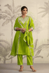 Immerse yourself in our Green Cotton Mulmul Gota Handwork A-Line Kurta Pant Dupatta Set! Crafted from soft, breathable cotton mulmul, this stunning set features a captivating A-line kurta adorned with intricate gota adda handwork. Delicate gota flowers and leaves and lace, embellish the yoke, front, and sleeves, creating a mesmerizing design.