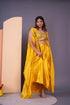Featuring a Yellow blouse in dupion silk base with mirror embroidery. it is paired with a matching pure georgette cape and dhoti shirt on satin base.
